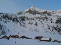 Laaaanger, blasenverursachender Zustieg von der Preunegg-Straße zur Ursprungalm - den Großteil des Weges mit Stirnlampe. Aber schließlich ist es soweit, und die Sonne beleuchtet die Bergspitzen ... ... um kurz darauf die Schneehänge in schöne Orangetöne zu kleiden. Die Gipfel westlich des langens Zustieges - von der Steinkarhöhe (links) bis zu Rippetegg und Schober (rechts)