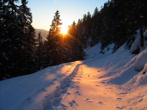 Die letzten Sonnenstrahlen genießend, kreuze ich meine Aufstiegsspur vom Vormittag.