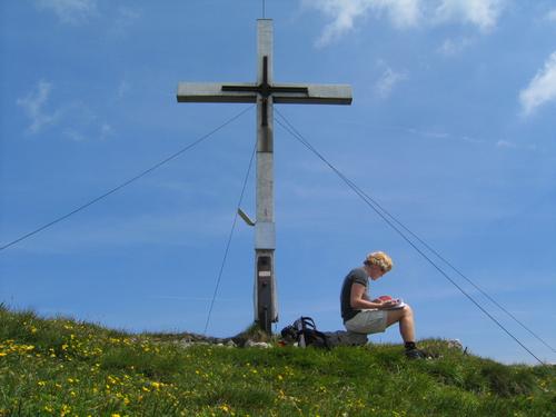 | Alleine beim Gipfelkreuz - Ingrid die Eintragungen im Gipfelbuch studierend. Die Fernsicht in die umliegenden Gipfel sowie zur Burg Gallenstein war nur durch etwas Dunst beeinträchtigt |
