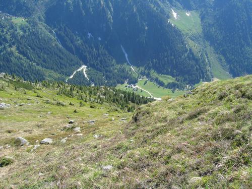 | ... und kann über steile Wiesenhänge erreicht werden. Bei Trockenheit nicht sonderlich schwierig, bergen diese Hänge bei Nässe oder Altschneefeldern aber nicht zu unterschätzende Tücken. Unten auf dem grünen Feld neben der Planneralmstraße liegt die Schrabacherhütte, an der ich etwas später vorbeikommen werde. |