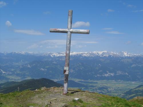 | ... zum aussichtsreichen Gipfelkreuz mit Tiefblick über das Ennstal um Stainach sowie die dahinterliegenden Gipfel des Toten Gebirges |