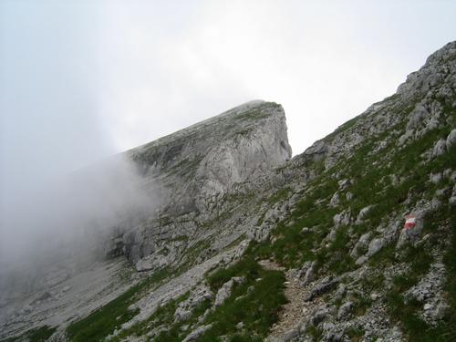 | Der zunehmend ausgesetzt werdende Weg über die Kölblplan ist in der Wanderkarte nur punktiert verzeichnet. Einige Sicherungen geleiten über die schwierigsten Stellen sicher hinweg. |