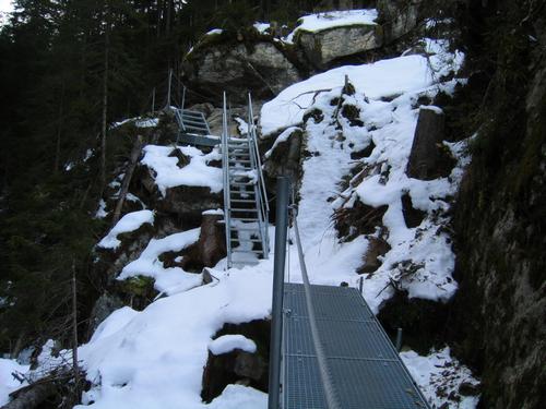 Über viele Eisenstiegen, einmal flacher und dann wieder fast senkrecht geht es neben und über dem schäumenden Bach aufwärts