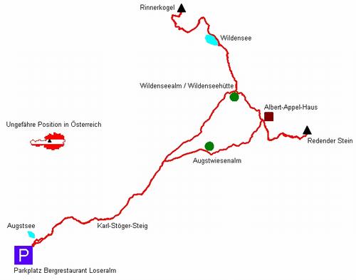 | Der Tourenverlauf mit "kleinem" Rundweg im Uhrzeigersinn: Start beim Parkplatz beim Bergrestaurant Loseralm. Über den Karl-Stöger-Steig (Tritssicherheit wird empfohlen) zu den Augstwiesten und weiter zur Wildenseealm mit der gleichnamigen Hütte. Über den Wildensee hinauf auf den Rinnerkogel. Abstieg zurück zur Wildenseealm und weiter zum Albert-Appelhaus und hinauf auf den Redenden Stein. Wieder zurück zum Appelhaus und Abstieg über die Augstwiesenalm. Aufstieg zurück über den Karl-Stöger-Steig zum Ausgangspunkt. |