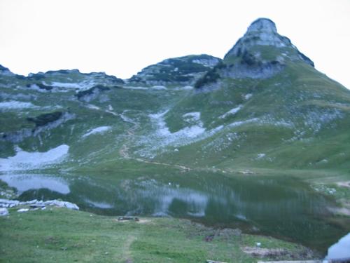 | Im letzten Tageslicht - und daher auch etwas unscharf und verwackelt - erreiche ich schließlich wieder den nahe des Ausgangspunktes gelegenen Augstsee mit dem darüber aufragenden Atterkogel. 10 Minuten später ging hier ein schweres Gewitter nieder. |