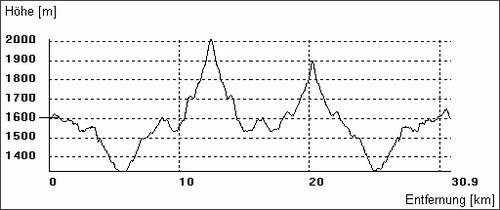 | Zwischen Ausgangspunkt und höchstem Gipfel liegen nur ca. 400 Höhenmeter - zwischen Niedrigstem und Höchstem Punkt weniger als 700 Höhenmeter und dennoch läppern sich auf dieser Tour fast 2.000 Aufstiegs-Höhenmeter zusammen. Im Höhenprofil sind die beiden Gipfel deutlich ausmachbar. |