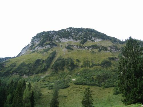 | Blick von der Sandlingalm auf die Nordhänge des Sandling. Der Nordaufstieg führt auf steilem Steig über teilweise glitschig-nasse Felsen, an 3 kurzen Stellen drahtseilgesichert zuerst zu einem Vorgipfel ... |