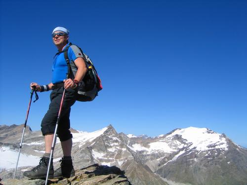 | Der weitere Wegverlauf führt über die unscheinbare (zumindest jene Stelle mit der Markierungstafel) Herzog-Ernst-Spitze. Hörbie posiert vor Sonnblick und Hocharn und blickt neugierig auf die nahe Schlüsselstelle ... |