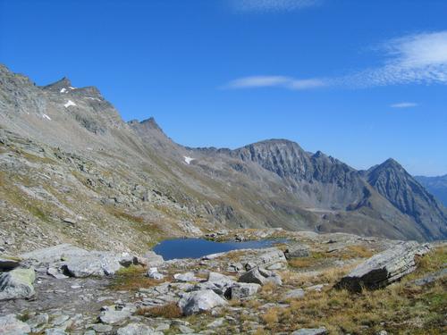 | Vor uns ein Teil des langen Überganges zur Hagener Hütte. In weier Ferne ca. oberhalb des Sees, in der Nähe des winzigen Schneefeldes (Siehe dazu auch einige Bilder weiter), werden wir zwischen den Gipfeln über die Feldseescharte wandern. |