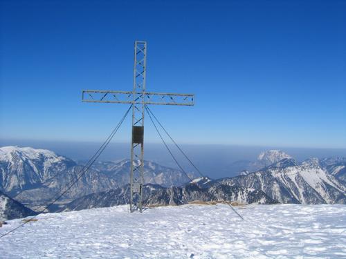 | Am windigen Gipfelplateau beim großen Eisenkreuz. Blick nach Norden zu Traunsee und Traunstein (rechts). |