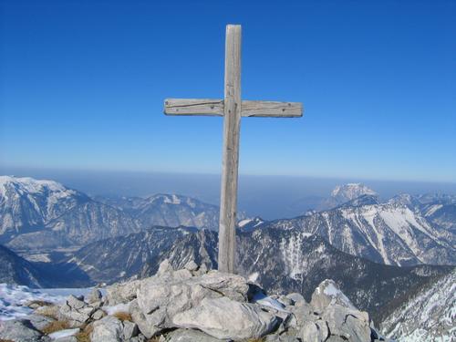 | Beim kleinen aber feinen Gipfelkreuz am 3 Meter höheren Ostgipfel, der über eine kurzen, felsigen, an einer Stelle leicht ausgesetzten Grat erklommen werden kann. Trotzdem ist er bei Weitem nicht so stark besucht wie sein westlicher Nachbar mit dem Eisenkreuz. |