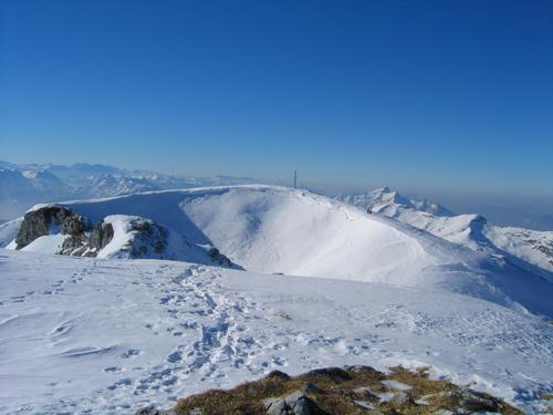 | Blick vom Ostgipfel auf den Westgipfel, mit der windschützenden Wächte, unterhalb der wir unseren Jausenplatz aufgeschlagen haben. Rechts unterhalb des Gipfelkreuzes sind Sonja und Ingrid erkennbar, die auch hier wieder aus fotografischen Gründen zurückbleiben mußten. Links sind die Felsen erkennbar, die die beiden Gipfel miteinander verbinden. |