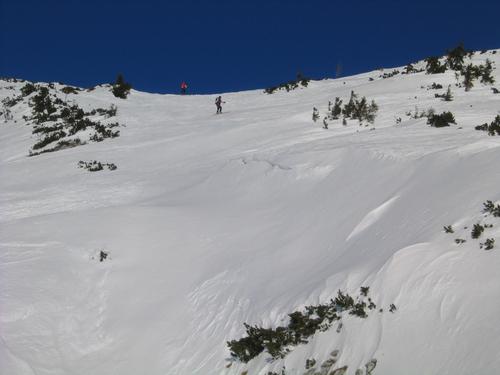 Abfahrt über stellenweise über 35 Grad steile Hänge auf der Westflanke.