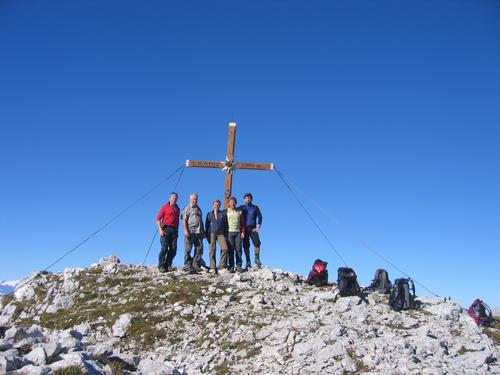 | Vom Sommerstein zum Gipfelkreuz am Schönegg ist es nicht allzu weit, und schon dürfen wir wieder zum Gipfelschnaps greifen. Links aufgefädelt die Teilnehmer: Hörbie, Hörbies Dad, Margit, Peter und AlpenYeti. Rechts aufgefädelt die Rucksäcke. Rätsel des Tages: Finde zu jedem Wanderer den passenden Rucksack. |
