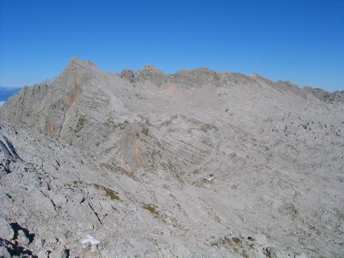 | Blick über das Steinerne Meer - weit unter uns das weiße Riemannhaus - links darüber das Breithorn, unser Nachmittagsziel. |