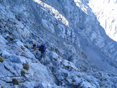 | ... und wenig später befinden auch wir uns in der ausgesetzten Wand, die Trittsicherheit und Schwindelfreiheit erfordert. Für geübte Geher ist es aber ein Genuß über die Felsen zu turnen ... |