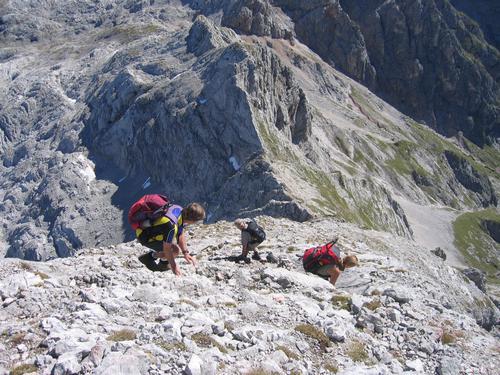 | Nach ausgiebiger Rast steigen wir über brüchiges Gestein und Schottersteige Richtung Osten hinab zur Buchauer Scharte ... |