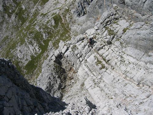 | ... die man über einige teils leicht ausgesetzte Felswände (AlpenYeti quert gerade ein schmales Band) ... |