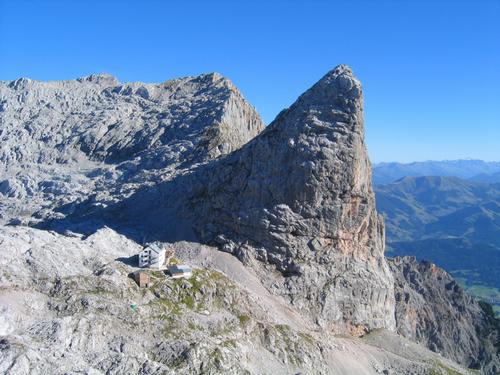 | Markant bohrt sich er der Sommerstein in den Himmel. Winzig wirkt das Riemannhaus - links zu seinen Füßen. |