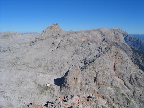 | Und noch einmal ein Tiefblick zum Riemannhaus. Auf diesem Bild kann man fast den gesamten Verlauf unserer Gipfelrunde erkennen: Vom Riemannhaus hinauf auf den Sommerstein. Über den Grat zu Schönegg und Wurmkopf. Nach kurzen Abstieg folgt die anspruchsvolle Überschreitung der Schönfeldspitze (hinten links). Und danach aus der Buchauer Scharte wieder über das gesamte Karstplateau zurück zum Riemannhaus. |