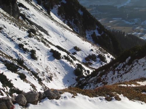 Ein Jäger stapft und rutscht gerade durch eine Rinne und den Steilhang ...