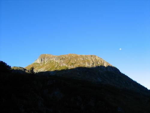 | Start bei der Vögeialm bei sehr frischen 3 ° C. Und je weiter wir nach oben kommen, umso stärker pfeifft uns der kalte Wind um die Ohren. Oben auf der Sonntagkarhöhe - unserem Nachmittagsziel - dürfte es in der Sonne schon erheblich wärmer sein. Auch der Mond (rechts des Hügels) scheint sich noch ein bißchen aufwärmen zu wollen. |
