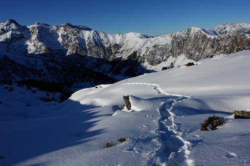 | Auf der Forststraße aus dem Sattental gab es ca. 5 bis 10 cm Pulverschnee. Ab der Schladminger Alm waren es ca. 20 bis 30 cm lockerer Pulverschnee - Ideal zum Schneeschuhgehen. Für eine Schitour fehlt ein kompakter Schnee am Grund, man sinkt meist bis zu den Almsträuchern und -wiesen ein. |
