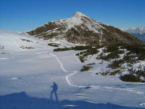 | Die ausgedehnte Almlandschaft liegt nun hinter mir - im Zentrum der Dromeisspitz. Ich liebe dieses meditative Dahinschlendern weitab jeglicher Zivilisation. Etliche Kilometer nur meine eigene Spur überblickend. |