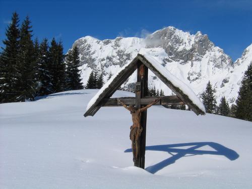 Ein Kreuz in der Nähe der Mödlinger Hütte. Im Hintergrund die Gipfel um Admonter Kalbling und Sparafeld.