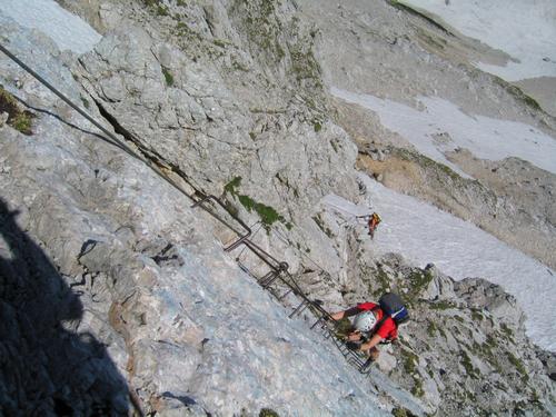 | ... bei den senkrechten Platten ist man froh über die "Eisenunterstützung", aber meist macht es mehr Spaß, ohne Verwendung dieser Hilfmittel - aber mit Selbstsicherung - im guten Fels frei zu klettern. Hinter Ingrid klettert noch eine weitere Wanderin, die wir unterwegs getroffen haben. |