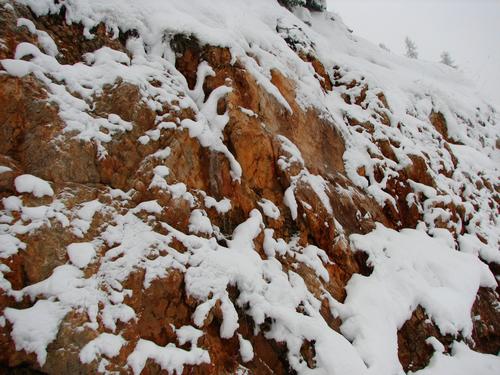 Den Steilhang unterhalb der Kaiserwand umgehen wir entlang der von rotem Gestein gesäumten Straße.