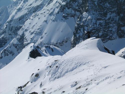 | Mehrmals vernehme ich ein Rufen, aber weder hinter mir aus dem Elendkar noch über den Normalanstieg aus dem Kühkar kommt jemand herauf. Es dauert einige Zeit, bis ich erkenne, daß da jemand über den Südostgrat heraufkraxelt - und noch etwas länger dauert es, bis ich meinen Bruder identifizieren kann. |