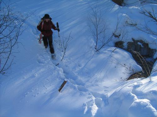 | Zu unserem Leidwesen verfehlten wir die richtige, noch nicht verzeichnete Forststraße und folgten stattdessem einigen Schispuren. Als wir - wie unsere "Vorfahrer" - den Irrtum bemerkten, steckten wir in einem Abbruch oberhalb des Karthäusenbaches, teilweise hüfttief im Schnee, und fanden endlich nach einigen vergeblichen Anläufen einen sicheren Übergang über den rauschenden und gurgelnden Karthäusenbach, mit folgendem Zu-Fuß-Steilaufstieg. Zynisches Detail am Rande: Wir trafen genau auf jene steilen, unangenehmen Engstellen des Karthäusengrabens, die wir durch unsere "Pfadfinder-Aktion" eigentlich umfahren wollten. |
