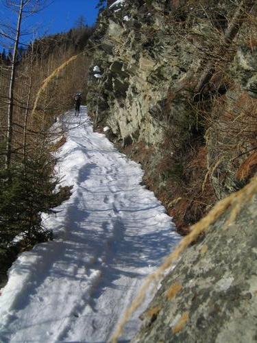 | Aufstieg über den besonders bei der Abfahrt "hochinteressanten" Karthäusengraben, ein schmales Schneeband - begrenzt von Felswänden und einem strauchbewachsenen, steilen Abhang. |
