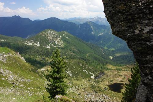 Ausblick aus der Scharte zu einigen kleinen Seen auf der Ostseite.