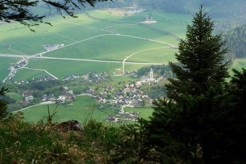 Am Weiterweg weist eine Tafel auf einen "Pürgg-Blick" hin - und tatsächlich öffnet sich der Wald und gibt den Blick über Pürgg frei.