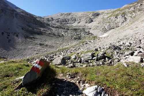 Über ein weites Kar, stellenweise etwas felsiger, aber unschwierig steigt man bergan.