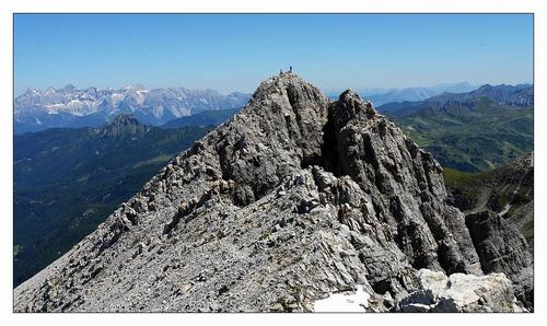 | Da sämtliche der ca. 10 Wanderer den nordöstlichen Vorgipfel zu ihrem Ziel erklären, und wir ein ruhigeres Plätzchen (wo vor allem auch nicht geraucht wird) vorziehen, gehen wir am Grat entlang zum höchsten und tatsächlichen Gipfel des Großen Pleißlingkeil. Blick zurück zum "bevölkerten" Vorgipfel. |