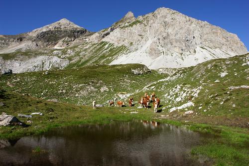 Bei einer Wiesenlacke empfängt uns eine Rinderherde.