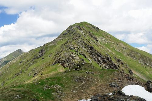 | Über den Höhenzug Steinkarhöhe - Tauernhöhe wandere ich zur Gollitschspitze. Dort wo der Grat etwas felsiger wird, kann man in die steilen Wiesenflanken ausweichen. |
