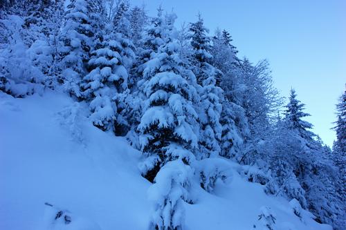 Aufstieg auf der Forststraße zwischen dem Ghf. zum Bergkreuz und dem Berghaus. Tiefwinterlich eingeschneite Wälder säumen den Weg.
