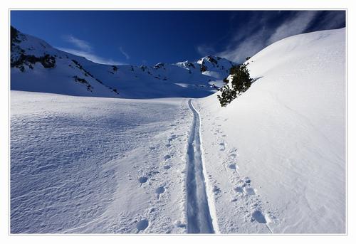 Und schließlich in ein herrliches baumfreies Kar. Der Aufstieg auf den Plöschmitzzinken erfolgt über den Steilhang im linken Bildbereich.