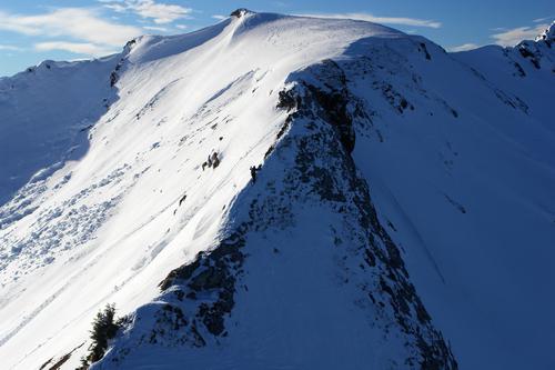 Auch jetzt bleiben wir aus Sicherheitsgründen auf der Gratschneide - Helmut in Bildmitte. Rechts steil abfallendes Felsgelände. Links steile Lawinenhänge.