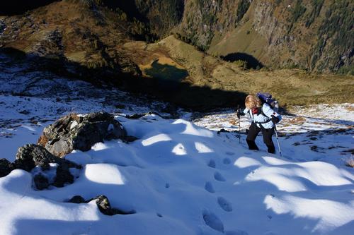 Auf den letzten Höhenmetern wird das Gelände noch etwas steiler - der Schnee wird tiefer.