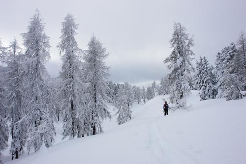 Am Plateau oben wandern wir parallel zu unserer Anstiegsspur südwärts und kommen fast genau beim "Abfellplatz" wieder hinunter. Von dort fahren wir bei perfekten Pulverschneeverhältnissen ab. |