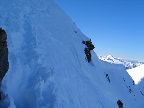 Die letzten Meter werden noch einmal sehr steil. Am Schluß geht es über vereiste Felsen auf den Grat.