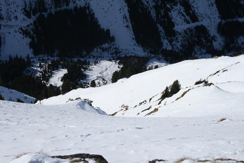 Einige Gämse auf und in der Nähe des Gipfels. Hier springt eine von ihnen als winziger Punkt (in Bildmitte) über die Südflanken hinunter Richtung Seifrieding, in die man aus dem Großsölktal über Mößna gelangt. |