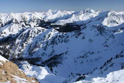 Gipfelimpressionen um den Eiskarlspitz und Hohenwart. Weiter rechts die Hochweberspitze (Tour vom 27.04.2007), ganz rechts das Laubtaleck (Tour vom 09.04.2006). Im Vordergrund unten das Aufstiegsgelände auf den Hochwart. |