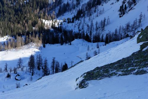 ... und da sehe ich auch schon unten auf der 2 Hochebene den ersten Tourengeher anrücken. Das Gebiet um die Zettlerhütte oben am Waldrand liegt bereits in der Sonne.