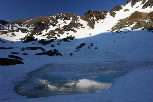| Vorbei bei einem kleinen See in etwa 1.950 Meter Höhe. Die Eisdecke ist bereits teilweise offen. |